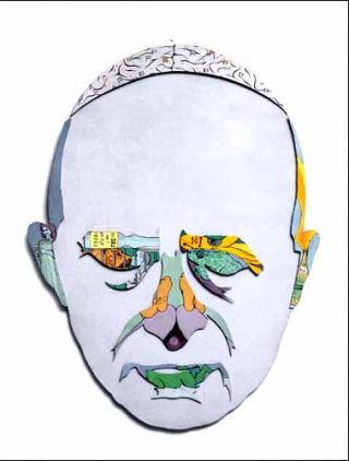 Voici donc le visage du souverain pontife aux traits composés à partir d’images diverses collectées sur des revues ou des comics, le tout reporté sur des magnets. Le nez dévoile une scène probablement érotique tandis que les oreilles et l’ombre du menton reconstituent les chromos de nos vieux cours d’histoire naturelle. L’ensemble est modifiable à l’envi. A chaque présentation de l’œuvre, un nouveau sacre finalement, avant l’irrémédiable déboulonnage.
