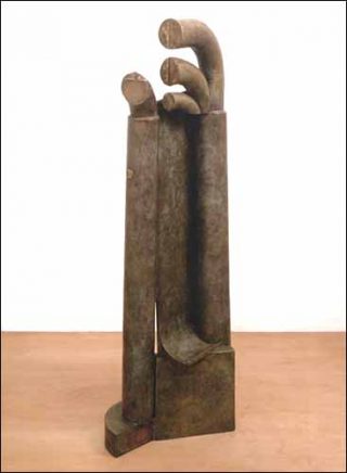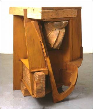Certaines sculptures, parmi les plus massives et monumentales sont constituées d’un assemblage de matières où le bois, l’acier oxydé et la pierre forment un enchevêtrement de plans au caractère vigoureux. Leur densité, la complexité de leur construction en rendent impossible l’appréciation totale. Il faut tourner autour de ces pièces hétérogènes dont l’ordonnancement se modifie avec le déplacement du spectateu, la sculpture dévoile au terme de cette promenade circulaire ses configurations possibles.