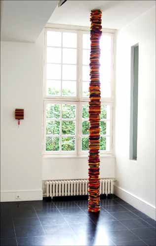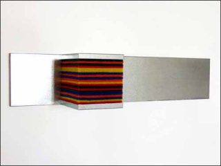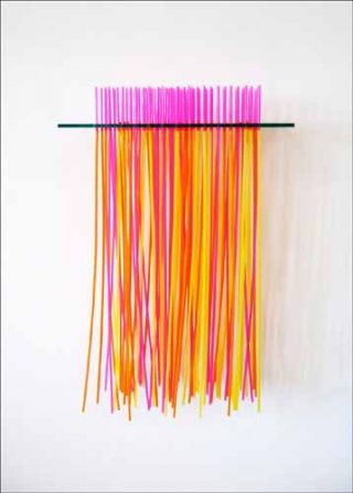 Antoine Perrot : Le propos léger n’est qu’apparent: l’ensemble de mes pièces s’inscrit dans une histoire de l’art abstrait et principalement le minimalisme. Elles conservent la rigueur des processus mis en œuvre et l’impact visuel direct, que la réalisation soit bi ou tridimensionnelle, mais elles inoculent au sein de cette rigueur une nouvelle légèreté, un caractère ludique, un brin d’humour. Ce déplacement, qui crée un nouveau regard, est engendré par les matériaux utilisés, qui ne référent pas à la peinture, mais plutôt aux classes populaires ou à des activités minorées socialement. C’est donc aussi une double revendication: une revendication picturale, la peinture dans son sens le plus large, si elle veut parler d’autre chose que d’elle-même, doit emprunter ses moyens aux matériaux contemporains ainsi qu’aux couleurs qui nous environnent; et une attitude que l’origine des matériaux et la force des couleurs employées spécifient clairement en donnant une dimension sociale à la peinture.