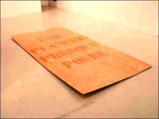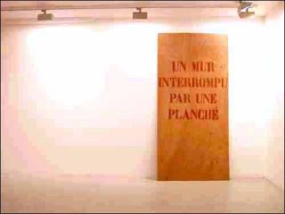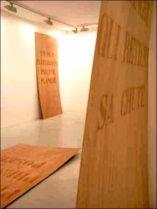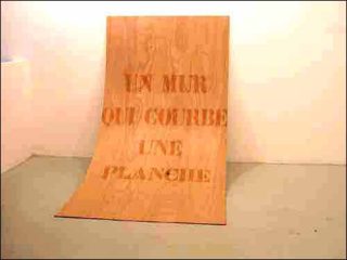 Le propos tend à se resserrer et l’expérience esthétique, celle de l’artiste comme celle du spectateur, s’en trouve d’autant plus radicalisée. « Un mur qui courbe une planche », « Un mur interrompu par une planche », « Une planche presque posée », « Une planche qui retient sa chut « , les textes gravés dans de la matière grasse — du beurre — exposent chacun une action réalisée au sein même de la galerie. La conjugaison des pièces d’aggloméré et des énoncés opère sur des niveaux sensibles et perceptifs qui jouent de leur rapport de force et de leur densité.