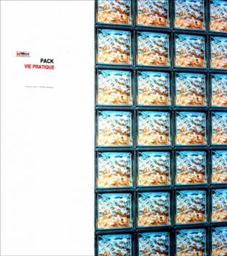 — Pack vie pratique. Logiciel d’aménagement intérieur, 2002. Ordinateur à disposition dans l’exposition, cahier recensant des intérieurs créés par logiciel format A4, cahier de textures format A4, mur couvert de papier motif «pavé de verre».