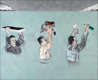 Les tableaux d’Apostolos Georgiou exposent, inlassablement, l’absurdité de la vie humaine. Jamais inactifs, les êtres qu’il met en scène consacrent leurs efforts à des labeurs qui semblent dénués de sens. L’absence de logique, de marqueurs temporels et de contexte des scènes peintes leur confère une dimension semblable au mythe de Sisyphe. Pour avoir osé défier les dieu, ce dernier est condamné, dans la mythologie grecque, à pousser éternellement jusqu’au sommet d’une colline un rocher qui en redescend chaque fois. Figure de la destinée humaine et de son écartèlement entre la recherche de sens et l’évidente absurdité de l’existence, Sisyphe semble s’incarner dans chaque personnage d’Apostolos Georgiou.