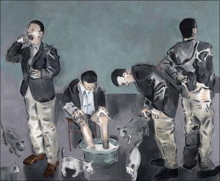 Souvent enfermés dans des lieux clos à l’ameublement minimal et sans fioriture, les personnages se détachent sur des fonds unis. Les activités auxquelles ils sont livrés ne fournissent pas davantage de pistes d’interprétation. Ici, un homme de dos repasse tandis qu’un autre tient et regarde un tissu portant la marque d’un fer à repasser ; sur une autre toile, trois hommes se suivent dans ce qui semble être la mer, l’eau à mi-corps, portant à bout de bras au–dessus de leurs têtes, l’un un verre et une bouteille, l’autre ces vêtements et le troisième une planche.
