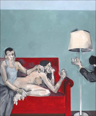 De toile en toile se répètent un style personnel et un vocabulaire précis qui forment la signature d’Apostolos Georgiou. Dans des tons souvent gris dont ressortent rarement quelques éclats de couleur plus vive, les tableaux déclinent une galerie de personnages et de scènes difficiles à interpréter. Les traits anguleux, quasiment géométriques, tracés par Apostolos Georgiou dessinent des individus semblables à des automates. Masculins et féminins, ils sont d’une apparence parfaitement neutre : hommes aux cheveux courts et en costumes ternes, femmes en tailleurs. Tous semblent interchangeables, dépourvus d’identité propre et même d’âge clairement établi. Leurs visages sont souvent réduits à des aplats abstraits, gommant tout expression et même parfois le regard.
