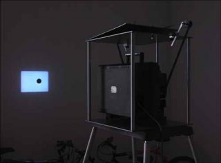 Jonathan Monk devient voyeur, examinant les faits et gestes des personnes qui se trouvent dans la galerie. Ce dispositif rappelle l’œuvre de Duchamp, Étant donnés…, dans laquelle les visiteurs pouvaient observer à travers deux trous opérés dans une vieille porte, la réplique du buste nu d’une femme étendue sur une couche de branchages.