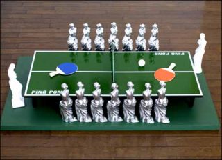 Tout y passe : les figurines en plastique des héros de l’enfance, les timbres ou le billard miniature. Il fait un sort à quelques idées esthétiques brillantes, entre autres les séries. Les Vénus antiques bordent les mini-terrains de tennis et autres tables de ping-pong comme d’artificielles cariatides de stuc.