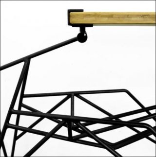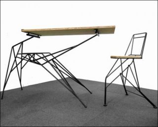 Sa nouvelle série Arachnide: bureau et chaise s’inspirant de la bête à huit pattes. Une nouvelle collection de mobilier sculpturale aux formes arachnéennes alliant acier et bambou à travers un jeu de «lignes» d’acier courbées. L’enchevêtrement métallique dévoile une anarchie maîtrisée dont la répartition des charges et le porte à faux fascine. Le tout pour simplement accueillir un plateau parfaitement horizontal.