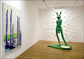 Les créatures d’Alain Séchas ont la peau verte et les antennes tendues ; un sourire amusé éclaire leur visage félin. Des objets volants non identifiés traversent nos références familières, visitant avec humour nos monuments artistiques et culturels.