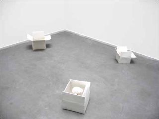 Au sol, de petites caisses en céramique blanche sont comme des fenêtres ouvertes sur des mondes miniatures. Rainbow Body, Prayers, Baby Foot, etc., sont autant de sculptures en forme de boîtes dont les pans ouverts sur le dessus laissent entrevoir leur contenant : objets et personnages aux formes simples et épurées. Ces petites sculptures, blanches elles aussi, mettent en scène des personnages, des objets comme les crânes et les couteaux, ou parfois des formes plus abstraites.