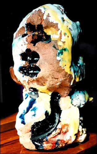 La multiplicité des points de vue que développent ces masses délibérément archaïques amènent inévitablement le spectateur à se déplacer, physiquement et mentalement. Jorn déforme, transforme comme il le fait dans sa peinture mais ici il utilise la terre, la céramique, les irrégularités du marbre pour faire surgir des figures imaginaires qui relient l’art populaire aux formes symboliques de la mythologie scandinave.