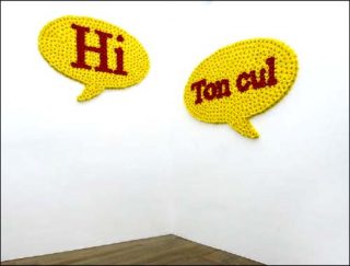 Composition florale ensuite, avec Hsai-Fei Chang et ses assemblages de fleurs synthétiques jaunes et rouges en forme de bulles de bandes-dessinées, dans lesquelles on peut lire «Hi» et «Ton cul». Utilisées à Taiwan dans les cérémonies funèbres, les fleurs synthétiques reviennent de manière récurrente dans l’œuvre de l’artiste, comme représentation de la beauté — une beauté «cheap» — et de la mort.