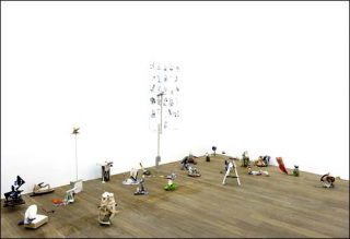— Mes compagnons d’infortune, mes compagnons de galère, 2007-2008. Bois, tuyau PVC, rubans, filin d’acier. 340 x 100x 290 cm