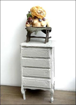— Ni joie ni peine, ni même l’ennui. Il se demande s’il existe encore, s’il existe vraiment, 2008. Grès, émail, colle à carrelage, bois. 140 x 45 x 45 cm