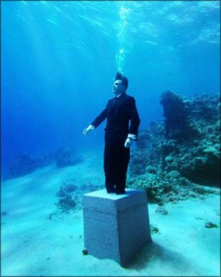 Dans ses performances, Philippe Ramette se fait photographier dans des postures défiant les lois de la pesanteur, ou sous l’eau vêtu de son costume-cravate, ou lors d’activités apparemment ordinaires.