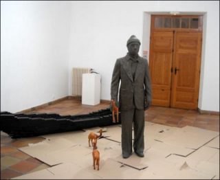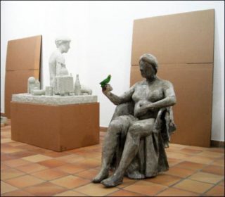 Dans l’exposition, le visiteur découvre des personnages à l’échelle un, certains revisitent des figures archétypales de l’art, ils captent notre attention, adoptent des poses identifiables comme autant d’allusions ou de références et sont présentés sur des socles en carton qui leur confèrent une certaine distance avec le spectateur. La confrontation des matériaux provoque une ambiguïté et les sculptures paraissent d’autant plus imposantes.