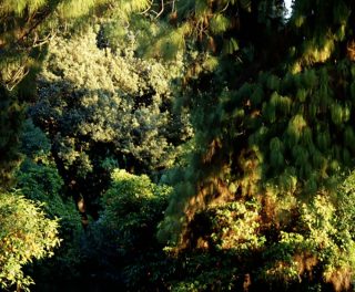 La fugacité et l’incertitude du bonheur se reflètent dans les choix formels de Daphné Boussion. Un cliché offre une vue plongeante sur des cimes d’arbres divers, un fouillis végétal émaillé de zones floues, d’autres surexposées ou au contraire complètement noires. Une autre laisse deviner, à peine, le fond d’un bassin dont les lignes des carreaux tremblent à travers l’eau. Une porte fermée laisse discerner l’horizon à travers son verre dépoli, telle une promesse radieuse.