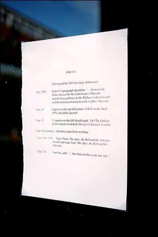 Comme le titre l’indique, c’est une page séparée de son lieu d’origine. Il s’agit de la page d’errata d’un livre qui, en l’occurrence, n’existe pas, du moins pas encore. Y figurent les titres de certaines pièces présentées dans l’exposition A Hole in the Life. C’était une façon de «créer de la légende» et, tout en renvoyant une partie de l’exposition à une origine commune, de reconnaître la distance qui sépare ces réalisations de leurs sources.