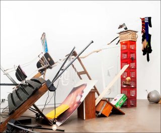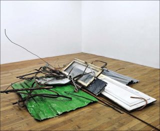 Sur le plancher, un tas de rebuts de bâtiments et travaux publics : morceaux de palissades en tôle, panneau urbain sur lequel on peut lire « Austerlitz », vieux battants de portes et de fenêtres, tiges métalliques. L’œuvre s’intitule Autodestrucción 3 : Mots et choses. Plus loin, une superposition de portes vitrées et de fenêtres dont l’équilibre semble précaire forme une arcade. A côté sont empilés une valise, un bloc de pierre, une cagette en plastique et un amplificateur. Se succèdent ainsi des agglomérats de déchets combinés selon des agencements précis, qui exploitent les formes, l’occupation de l’espace, la symétrie, la stabilité…