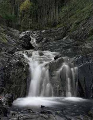 Dans la Cascade de Confolens, sombre et d’une netteté quasiment irréelle, une cascade coule comme un fluide très mousseux entre une muraille de roches rendues brillantes par l’humidité.