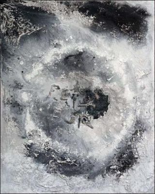 On y aperçoit – plus qu’on y lit – le mot « pesanteur », mais aussi le mot « mot », qui se met lui-même en abyme, aux confins des nuances de gris. Souvent contorsionnés, ils flottent dans la matière toujours dense, et semblent essayer de toutes leurs menues forces de s’échapper du typhon, de réchapper d’un naufrage. Leur force est peut-être mise à mal, voire absolument vaine, mais leur existence est irréfutable. Sous leur signification contrariée par la matière qui s’écoule ou s’agite, par le geste du peintre qui renfrogne son œuvre, les mots apparaissent tout de même avec l’éclat voilé d’une épiphanie, telle que celle d’un visage qui enjoint le message le plus net et le plus sacré « tu ne tueras point ». Si la visagéité est la puissance propre au visage, ici Gérald Thupinier fait surgir une force nouvelle, propre aux mots des centres des tableaux: non pas la poésie, ni la rhétorique, encore moins la puissance lexicale mais le triomphe des mots brisés. Ici la peinture porte aux nues les mots qui, tels des corbeaux qu’on nourrit, finissent par crever les yeux du spectateur.