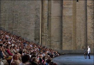 Le texte est un chant d’amour au présent qui fait revivre une forme d’anxiété et de fébrilité, et parle de l’admiration pour les metteurs en scène et les acteurs dont la présence a marqué tous ces lieux et s’est inscrite quelque part dans les murs et au fond des mémoires. Celui qui se promet d’y revenir un jour et y est revenu en effet à de nombreuses reprises, fait se superposer différentes couches de temps et propose à Denis Podalydès, d’ailleurs cité dans un passage du texte, de jouer le rôle du lecteur.