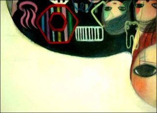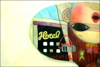 L’accrochage est un fourre tout agréable, dans lequel il est doux de fouiller. Les dessins sont mis ça et là , éparpillés dans une constellation méthodiquement étudiée pour faire vide-grenier, mais façon art contemporain. Les murs sont donc tapissés de formats et de supports tous différents, on glisse de l’un à l’autre, d’un petit papier à une toile aux dimensions plus grandes, d’un croquis en noir et blanc à un collage en couleur. Des tableaux descendent du plafond, il faut faire attention pour ne pas se cogner dedans, le tout n’est pas aérien mais fluide comme la peinture de Takano.