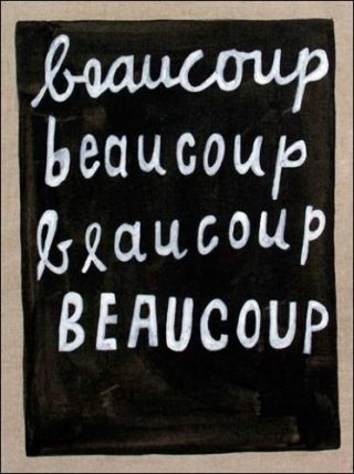 B.a-ba, la succession d’Alpha et Bêta (issus de l’alphabet grec), signifie à la fois l’apprentissage d’une langue ou d’un domaine mais aussi l’ensemble de ses connaissances primaires. Un système élémentaire dont l’équivalent anglophone n’est autre qu’abc. Trois simples graphèmes et voilà que se dessine aussitôt une initiation au langage ou plutôt une invitation à dériver vers un certain méta-langage. A, Acrylique, Ananas, Always on time, B, Baci, Banana, C, Chloé, Lemon, Oui, Non, Kiss Kiss. Des peintures signalées par un nom – à ne pas confondre avec un titre – parfois même habités par un seul signe.