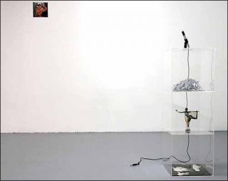 — Heroes, 2006. Cubes en Plexiglas transparent, pochette de disque, perruque de guirlandes, coupures de magazine, bois, micro et porte-micro. 112 x 32 x 32 cm.
