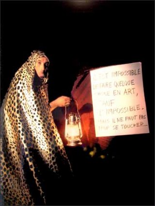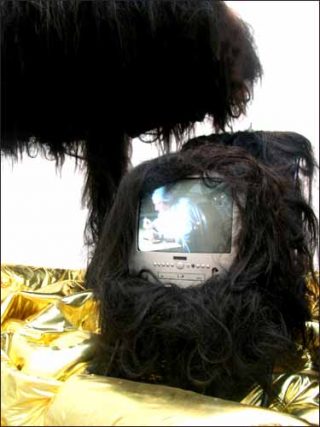 Des téléviseurs, comme assis dans les chaises longues ou allongés dans les sacs de couchage, sont enfouis dans cette pilosité d’où l’image vidéo, comme l’œil de la bête, regarde le spectateur. L’écran montre l’artiste enveloppé dans une toge noire en train de se tortiller dans le champ restreint de la caméra, et de dévoiler, à la manière d’un exhibitionniste, non pas ses parties velues et intimes, mais une feuille blanche portant l’inscription « On est réellement beaux ».