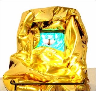 — Baba Island (sujet doré), 2003. Technique mixte, moniteur DVD, DVD. Environ 210 x 310 x 160 cm.