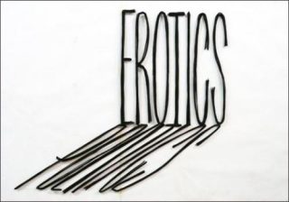 En tant que signes graphiques, les mots peuvent avoir deux sortes de matérialité: celle conférée par leur sens, et celle que leur graphie dessine. Ainsi les mots «Erotics» et «Politics», en majuscules exagérément allongées, dessinent-ils un immeuble et son ombre. Un mot-image pour dire les accointances de la politique et de la séduction.
