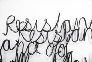 Finalement, Anita Dube traite les mots comme des fétiches. Des fétiches de velours noir… Au mur, un texte de Walter Benjamin, extrait de son ouvrage Theses on the Philosophy of History, est reproduit en écriture déliée, à l’aide de fins tuteurs que recouvre un sombre velours. Si pour ce penseur, l’histoire est une structure emplie par le temps, pour Anita Dube, l’histoire semble être une structure emplie par les mots. Cette Å“uvre fait irrémédiablement penser aux mots tissés d’Annette Messager, réunissant à la fois la lutte personnelle — car ce travail minutieux en velours appelle l’intime — et la bataille commune, de par le message que transmet le texte.