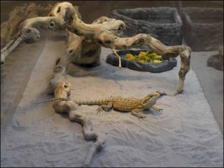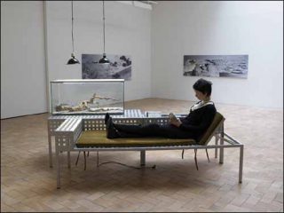 — In Bed with a Cold Blooded Animal, 2008. Structure en acier perforé, vitrine, lampes, branche, coussin, lézard. 114 x 236 x 140 cm