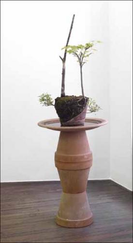 D’emblée, une œuvre retiendra le regard du spectateur. Il s’agit de Plante morte en pot de Michel Blazy. Un pot de fleurs en terre cuite, posé sur un piédestal révèle la nature comme sculpture. Une ampoule allumée est suspendue à la verticale. L’œuvre associe des idées absurdes: faire pousser une plante morte sous une lumière électrique. Bricolée dans un équilibre précaire, la pièce est ensuite laissée libre de vivre et d’évoluer. Elle encourage puis explore la transformation de la nature. Les œuvres de Michel Blazy s’apprécient toujours dans la durée et l’épaisseur du temps, elle se laissent contempler. Observation du vivant et du mort et du passage entre ces deux états, ce brin de nature dans l’espace de la galerie questionne nos rapports au vivant.