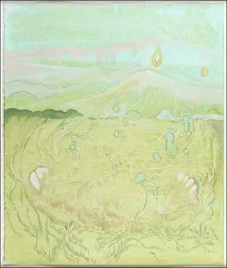 Fantasmagoriques, ces bribes de paysages et divagations se dissolvent les unes dans les autres pour renaître différentes. L’univers de ces œuvres est constitué d’une matière vivante. Psychédéliques, elles renvoient au monde des années soixante, un monde qui voulait démocratiser les savoirs sacrés et scientifiques et refonder une société idéale, miroir de la mission de l’art de cet artiste.