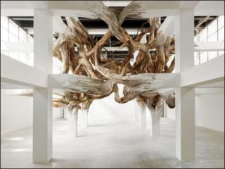 Car tout se passe comme si le bâtiment reprenait vie, comme si la matière morne et manipulable à volonté par la main de l’homme et de ses outils, se trouvait regagner son autonomie et se développer suivant son propre rythme de croissance. Les piliers et poutres couverts de peinture blanche éclatent ainsi en des bouquets de branchages et de troncs. «Baitogogo» s’élance alors dans une structure complexe, arborescente, tel un système de synapses, un réseau neuronal — Henrique Oliveira dit d’ailleurs s’être inspiré des livres de médecines et des neurosciences pour donner forme à son installation —, ou comme une structure de rhizome.