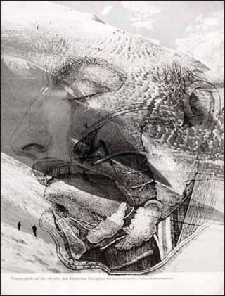 Tout un jeu du dessus-dessous, d’exhibition-dissimulation, qui conjugue des photographies noires et blanches d’une utopie de bonheur, représentant des individus heureux et nus en communion avec le soleil et la nature, et des dessins, repris de livres de sciences naturelles, de têtes de serpents, serres d’oiseaux, chiens hurlant ou chauffe souris. Quelques choses de la poésie offensive et noire d’un Lautréamont ou d’un Max Ernst apparente cette esthétique à un certain surréalisme. Un peu plus loin sur le mur, un cadre-boîte fait office d’œuvre manifeste: un singe en plomb (qui n’est pas sans faire penser à l’autoportrait en singe de Chardin) se tient derrière une vitre maquillée en grille à oculus, comme pris au piège par le jeu de l’exposition. L’exposition, ou la mise au zoo de l’artiste? Pour Barbara Breitenfellner, il n’y a certainement qu’un pas.