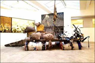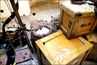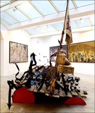 Dans la pièce principale, on découvre une grande sculpture intitulée le «Cockpit», mais qui ressemble davantage à une sorte de rafiot fait de bric et de broc, rafiot à la fois futuriste et décadent. Sur ce rafiot, des sacs de «beans» (haricots), des bidons et des peaux de bananes côtoient paradoxalement des formes géométriques très élaborées qui rappellent les schémas moléculaires.