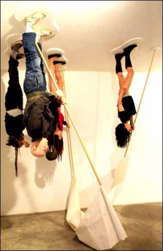 — La Révolution à l’envers, 2007. Technique mixte, cire, cheveux, vêtements, bois. 310 h x 210 x 170 cm.