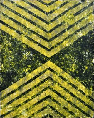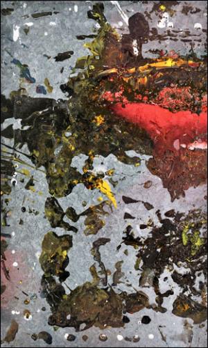 Tandis que la peinture dégouline et se laisse absorber partout où elle peut, elle pénètre des strates inférieures et invisibles où, tout en disparaissant, elle devient une résurgence imprévisible.