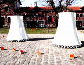 À l’extérieur, deux maquettes de tours de refroidissement de centrale nucléaire, étincelantes de blancheur, posées à terre, fonctionnent comme des portes d’entrée de l’exposition. Révélateurs d’échelle et symboles de puissance nationale, elles convoquent des sentiments mêlés d’une certaine familiarité (en tant qu’éléments du territoire français) et de sourde inquiétude face au risque nucléaire.