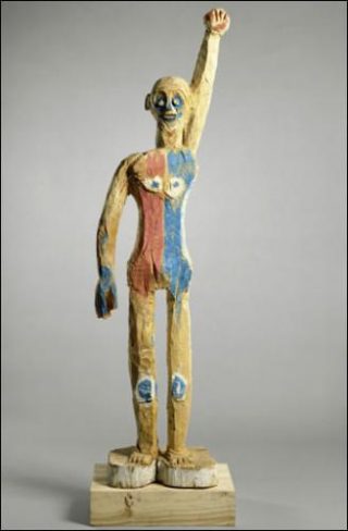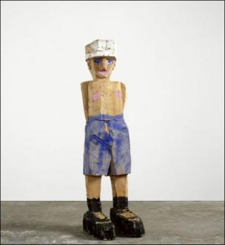 S’il y a bien un petit côté totem et tabou dans ces forêts de gestalt, un petit air bucheronnesque aussi dans l’allure de l’artiste, cela, finalement, est de peu d’importance. En vérité les photographies d’atelier donnent davantage l’envie de voir, non pas l’artiste à l’œuvre, mais ses restes. Voir comme autour des effigies ébarbées les copeaux errent, car on sent bien qu’ils leur reviennent aussi. Sur chaque figure, en effet, une place manque qu’une doucine a ôtée; stigmate de l’absence qui dit de l’art et sa nécessité et sa violence.