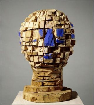 Il suffit ainsi de deux tampons de peinture blanche pour que les géants pleurent et qu’on redécouvre en eux la figure triste immense de Sans titre (1982), dont les grands yeux en tourbillons évoquent immanquablement ceux de Peter Lorre — mélancoliquement fous. Près de Lorre donc, puisque désormais ce bout de bois a un nom, il y a un autre fou, Tête-G (1987). C’est un nœud de hêtre pourpre éclaté en carreaux, avec pour toute face six badigeons d’huile bleue, et pourtant c’est une mappemonde aussi, avec ses rides méridiens et des cernes sans âge.