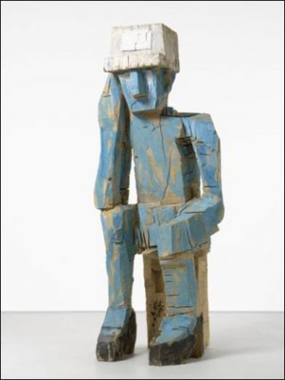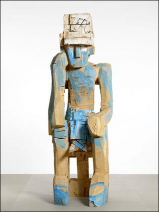 Avec le temps, les figures de Georg Baselitz se sont «désarrondies», elles se sont «décourbées»; elles ont — sans perte — abandonné ce qui leur restait de finesse. Comme dans sa Chose à carreaux (1994), l’artiste semble avoir été tenté quelquefois de retrouver la douceur des contours, des lignes et des arêtes de ses sculptures en les ceignant de toile, en les emmaillotant. Le risque inhérent au procédé est bien sûr que l’on confonde la chose sculptée avec une momie, avec cette sorte d’être paraissant vivre encore, et encore respirer sous le tissu, au point que sous lui le bois s’oublie, et qu’à l’icône se substitue l’idole.