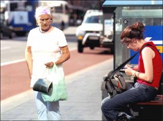 Avec George Street Bus Stop 01-23-01 (janv. 2001), Beat Streuli propose deux vidéos diffusées simultanément sur moniteurs. Derrière un bruit assourdissant de circulation routière, l’image nous livre un ralenti de piétons. Puis le son est coupé. Des personnes marchent, montent dans le bus, passent. Des visages observent, attendent, quelque chose, quelqu’un. Des corps écoutent une musique, écouteurs dans les oreilles. Et derrière, les voitures passent.