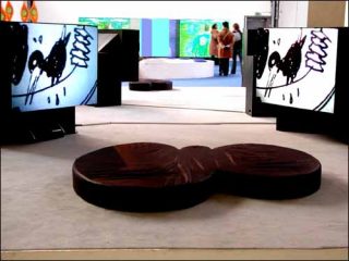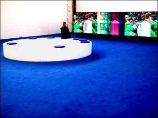 Telle est le sens de la vidéo-installation Colors. Sur les trois écrans défilent à l?envers du sens traditionnel (de droite à gauche, donc) les images montées rétroactivement d’un match de rugby où les visages et les tenues des joueurs sont recouverts de peinture. Convergence de la trace et de la tache : les corps sont maculés, la pluie se mêlant de la partie, par la peinture des publicités qui « décoraient » la pelouse du stade, traces de la société de consommation et de son omniprésence.