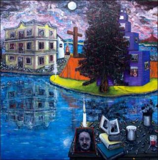 Ce n’est pas tous les jours qu’on rencontre un héros amoureux, un artiste brillant. Ses dernières toiles sont de nobles combats, avec de beaux gestes comme on peut en voir sur un ring ou dans un stade. Ni chiche ni chiqué. Des tubes de peinture écrasés, des palettes chamarrées, des croix, des corps malmenés, le chien de l’artiste immobile, le peintre debout parfois un peu sonné d’avoir tant donné ou encore son impassible effigie. Et des paysages aux couleurs somptueuses, des horizons lointains, des baraques mystérieuses. Une invitation au voyage, mais en passager clandestin. Bref, du dépaysement comme on en vit rarement. Il faut aller voir sa dernière exposition, sans hésitation et sans repentir. Comme Cravan boxait, comme Rimbaud poétisait, comme Van Gogh peignait.»