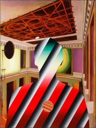 Chacun est intervenu sur les toiles de l’autre. Les couleurs éclatantes et criardes de Ben Hübsch sont venues habiller les architectures aux couleurs sourdes de Martin Kasper. Ses figures découpées prennent également une toute autre dimension lorsque Ben Hübsch les pare de couleurs et de rayures chatoyantes. Elles en habillent la silhouette ou au contraire en figure le fond. C’est principalement cet ensemble de toiles qu’ils nous donnent à voir dans cette exposition.