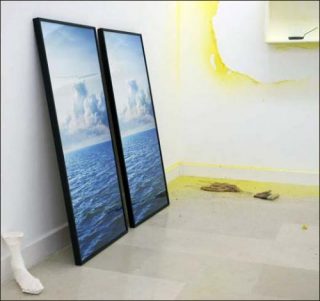 Dans une mise en abîme, tout ce qui a occupé l’espace de la galerie est présenté sous forme de grandes photographies posées contre les murs, avec des vues d’autres galeries de la Villa Arson, mais aussi de la mer ou de jardins voisins. Ce qui perturbe notre perception du lieu.