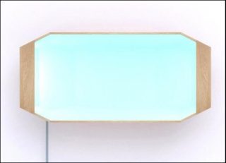 – Aspherical Skylight, 2010. Plaquage chêne gris blanchi, peinture « blue ground » ultra-mat de Farrow & Ball, tube fluo lumière du jour, câblerie. 133 x 23 x 60 cm.